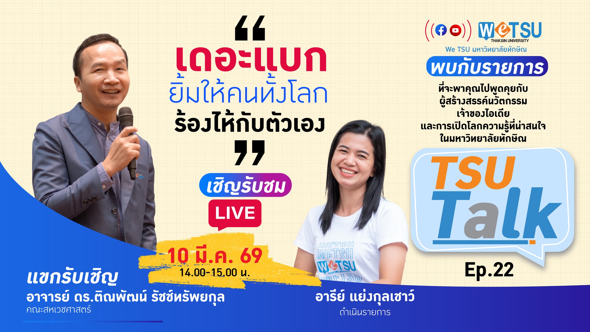 เชิญรับชมถ่ายทอดสด รายการ TSUTalk ep.22 เดอะแบก ยิ้มให้คนทั้งโลก ร้องไห้กับตัวเอง...